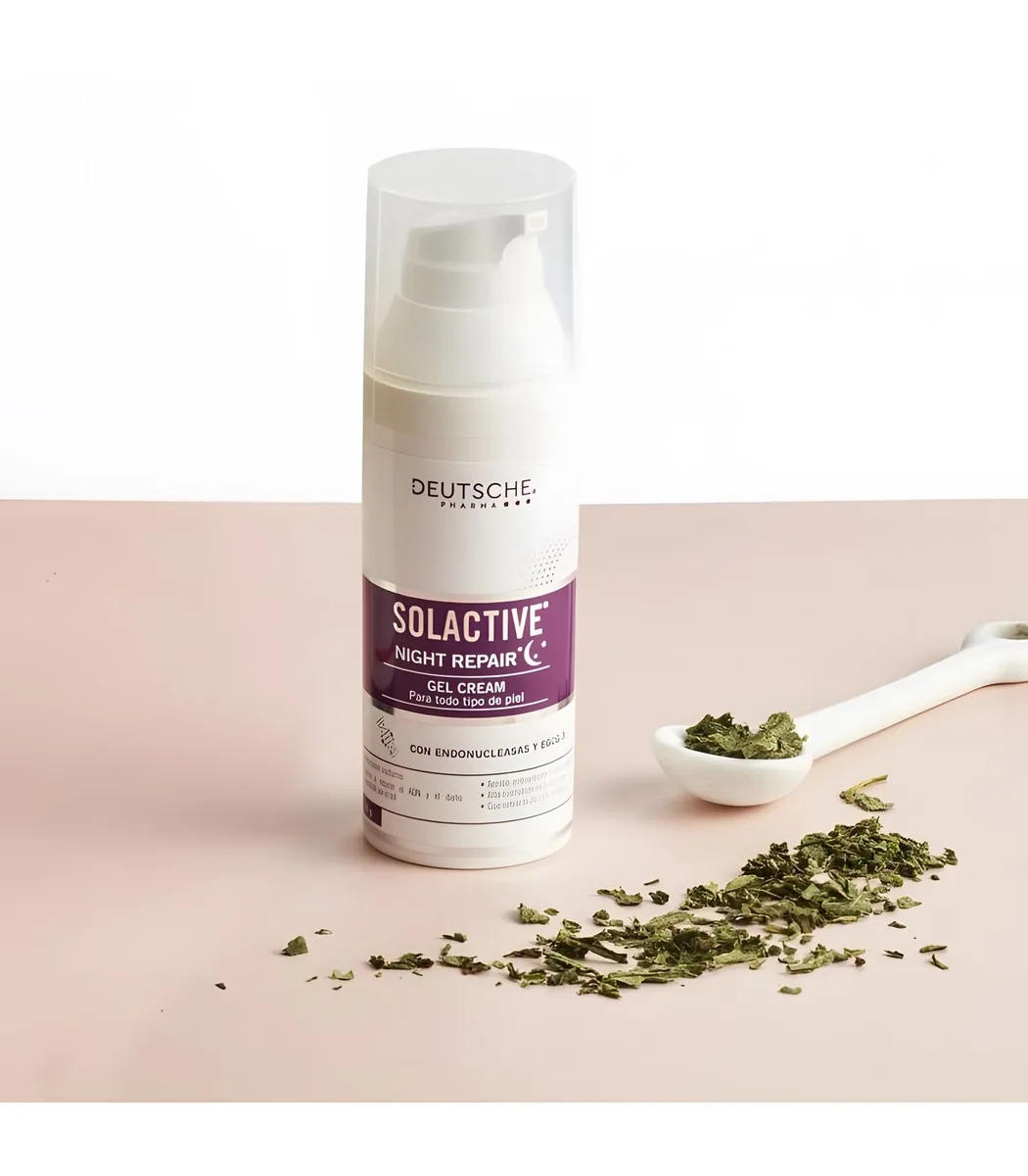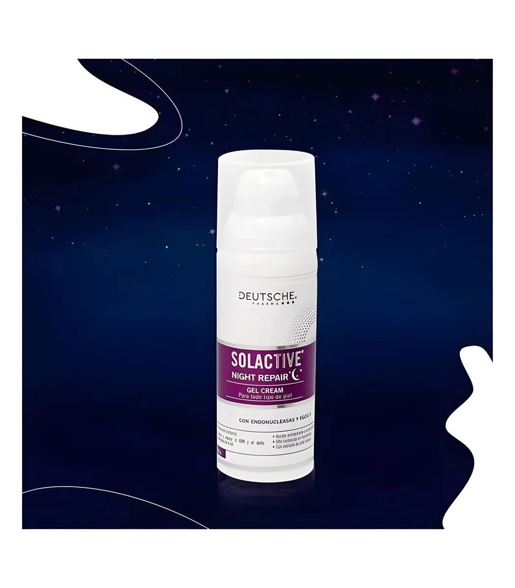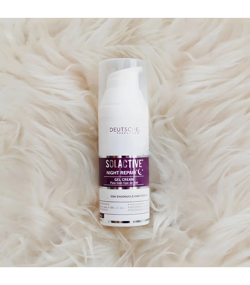 SOLACTIVE NIGHT REPAIR es un tratamiento nocturno con tecnología moderna que ayuda a reparar el ADN de la piel dañado por la exposición solar diaria. Gracias a su combinación de endonucleasas, extractos antioxidantes y complejo de flavonoides, este gel-crema combate la glicación, mejora el tono y la firmeza, y previene el envejecimiento prematuro. Ideal como primer paso en tu rutina nocturna, permite una reparación profunda mientras duermes.