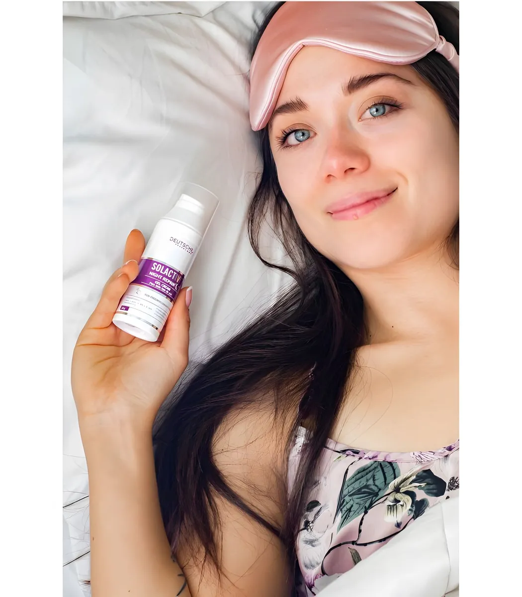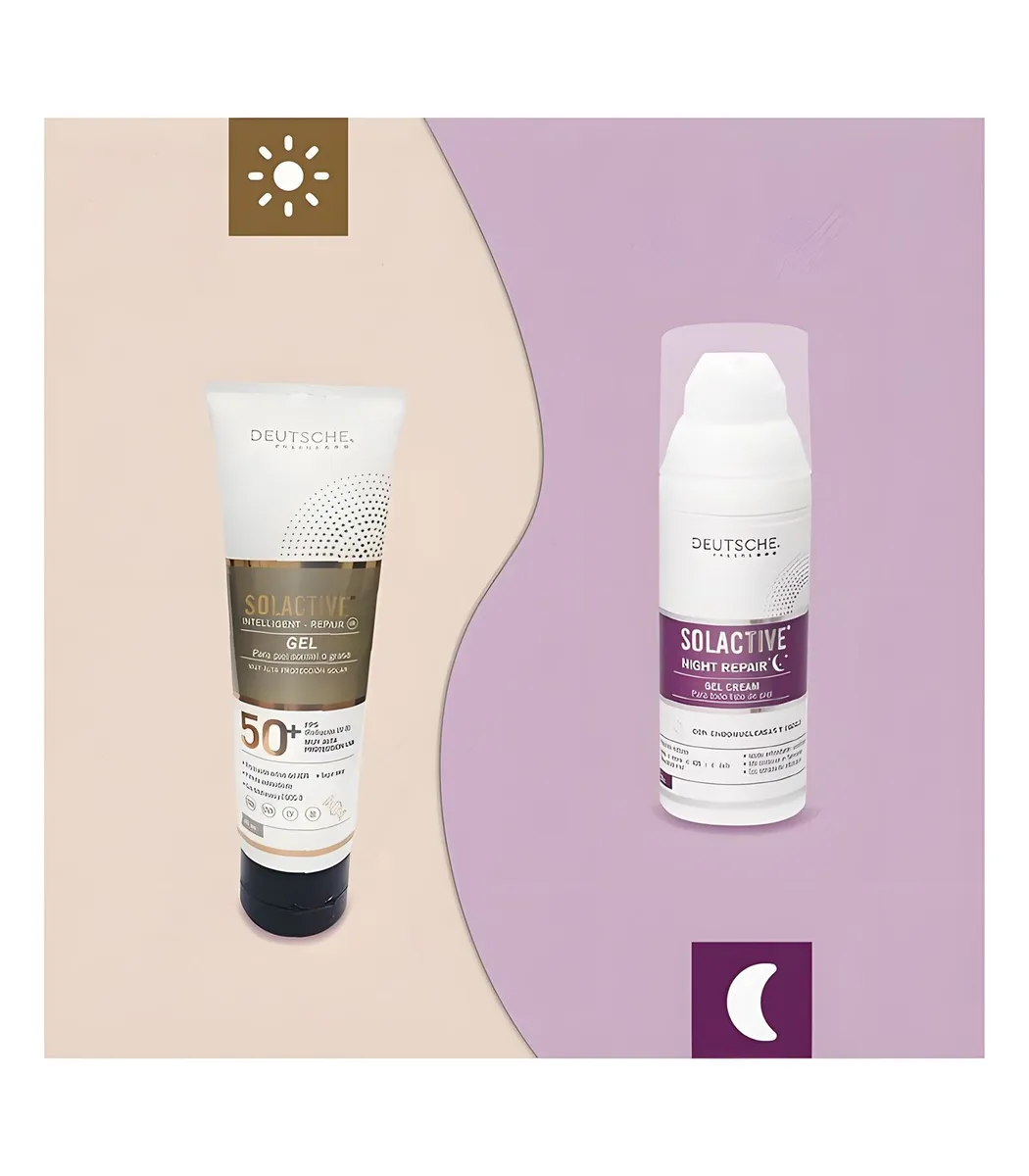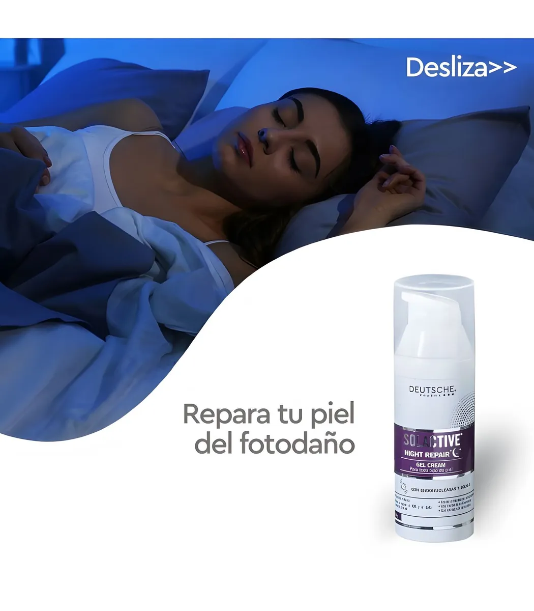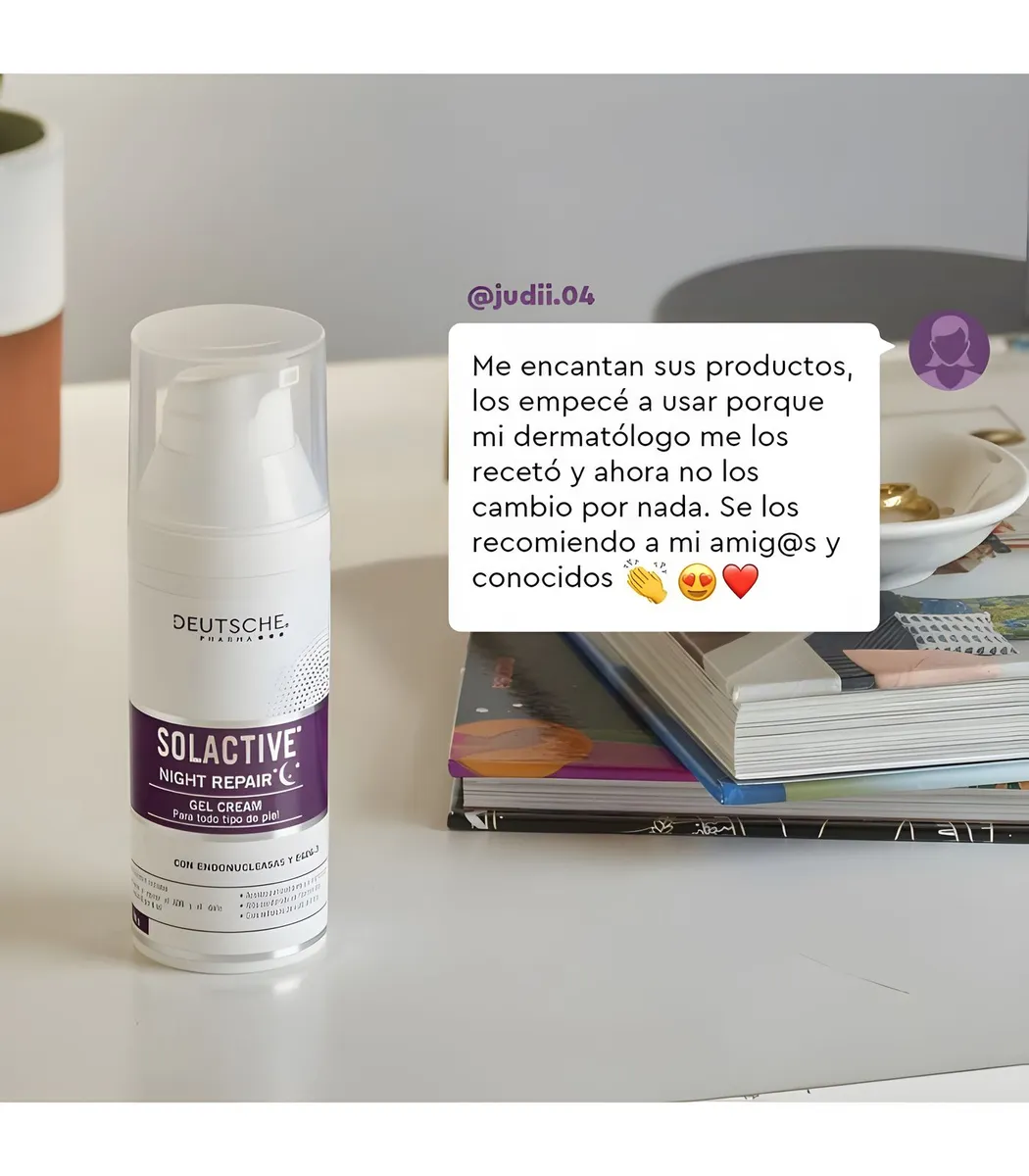 SOLACTIVE NIGHT REPAIR es un tratamiento nocturno con tecnología moderna que ayuda a reparar el ADN de la piel dañado por la exposición solar diaria. Gracias a su combinación de endonucleasas, extractos antioxidantes y complejo de flavonoides, este gel-crema combate la glicación, mejora el tono y la firmeza, y previene el envejecimiento prematuro. Ideal como primer paso en tu rutina nocturna, permite una reparación profunda mientras duermes.