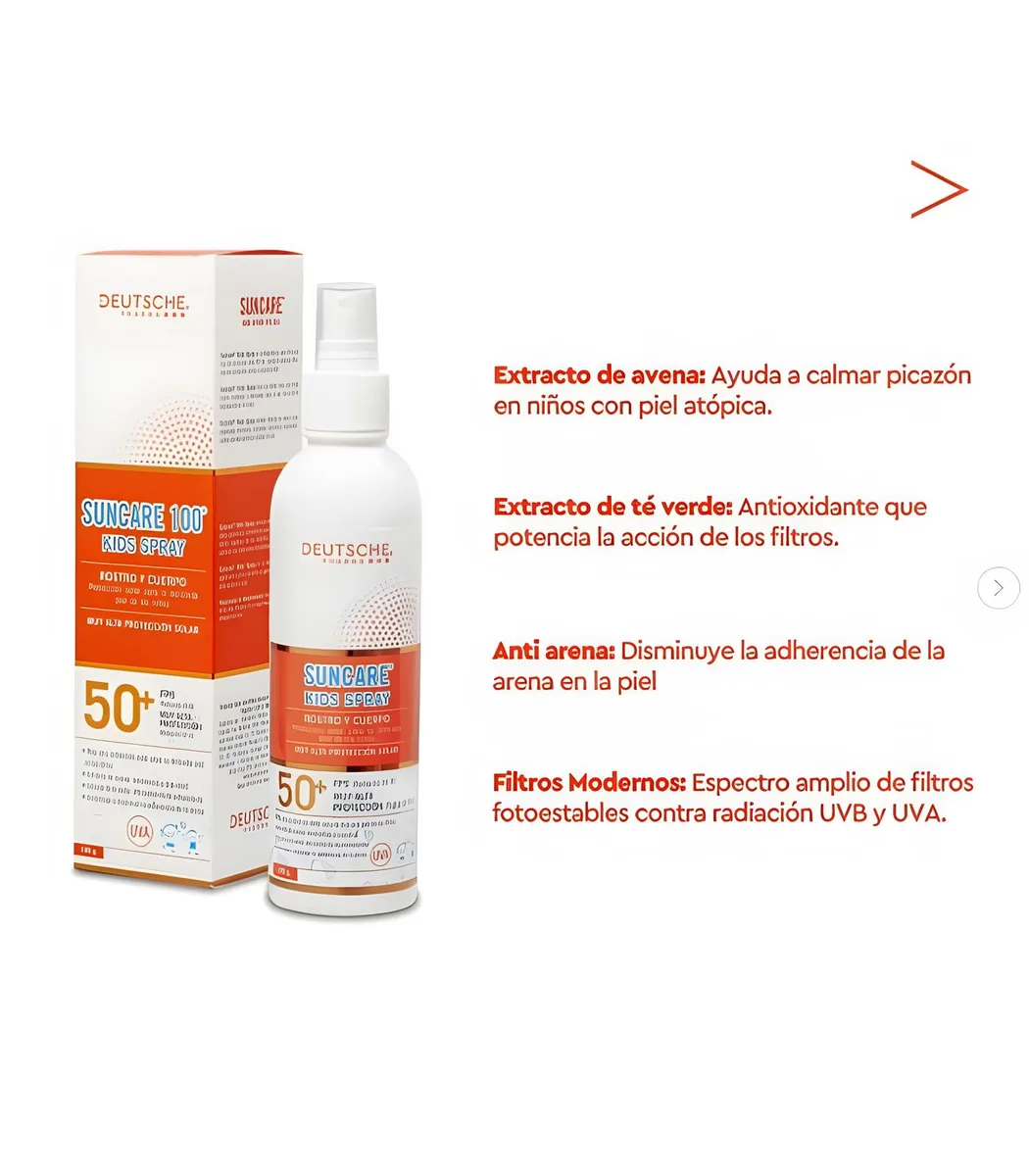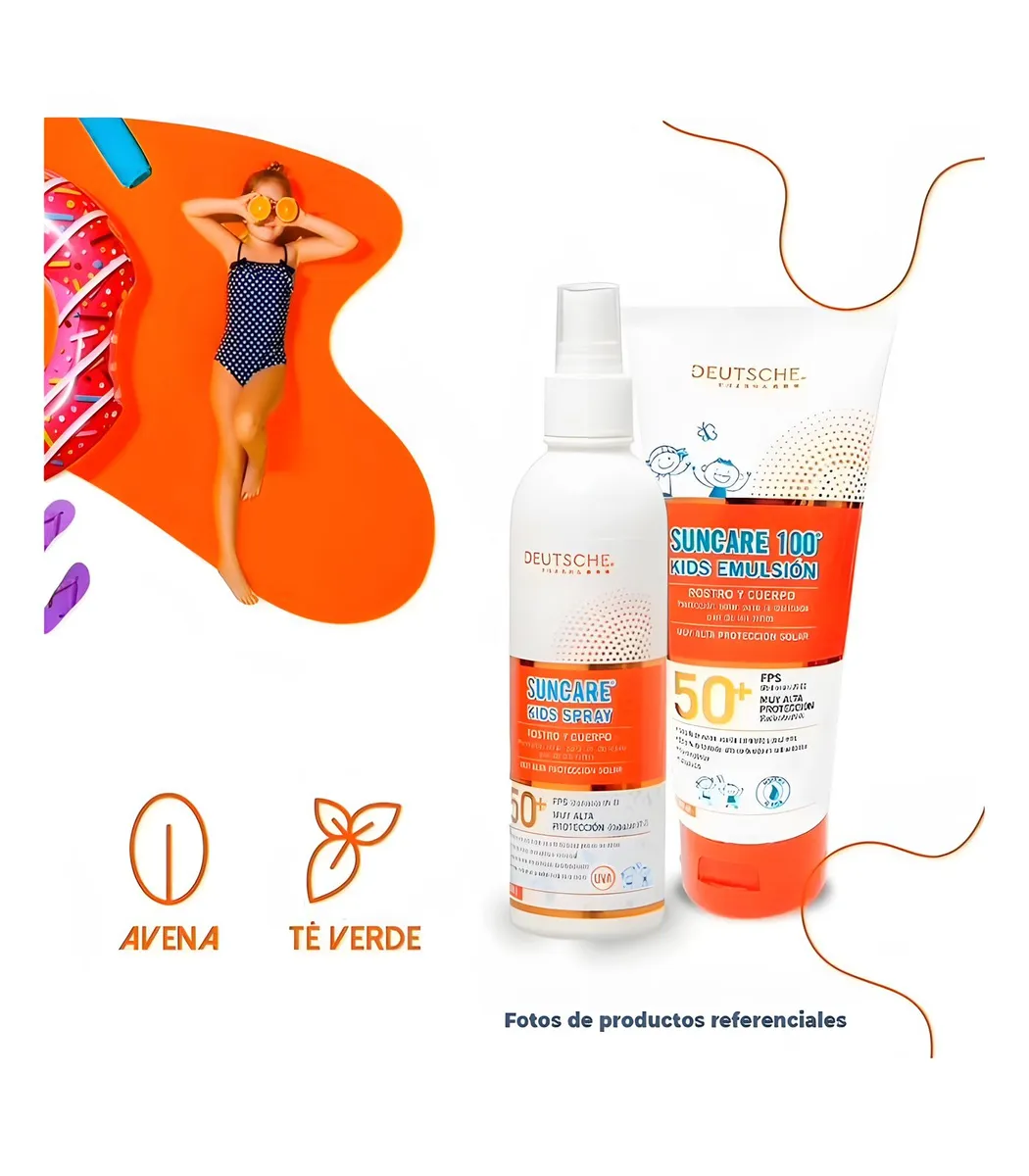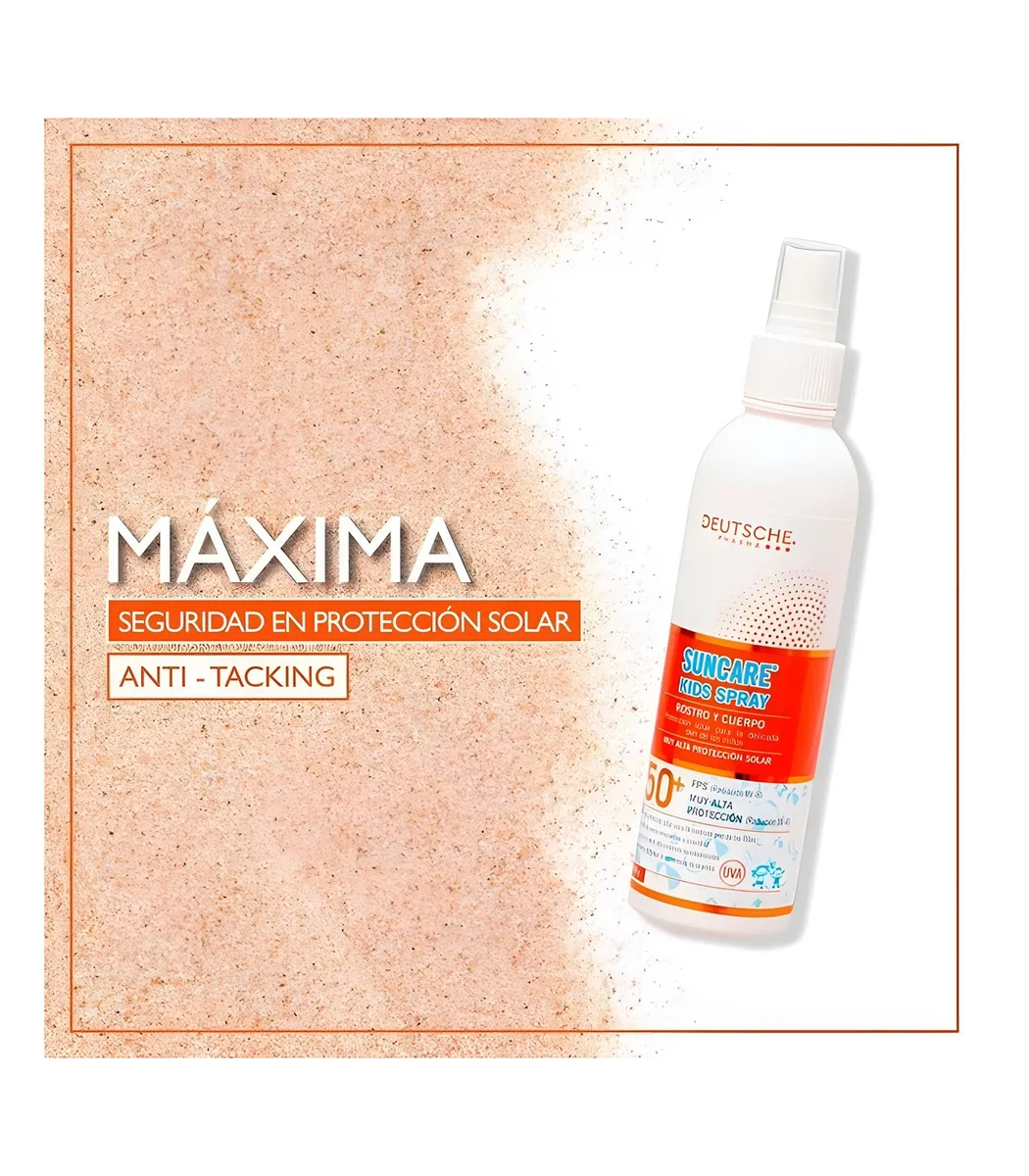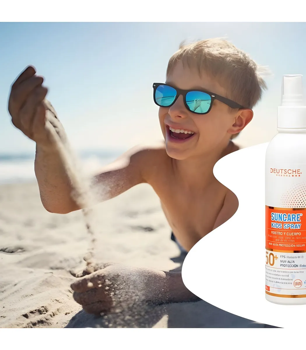 Suncare 100 Kids Spray es un fotoprotector con filtros solares modernos, diseñado especialmente para proteger la piel delicada de los niños frente a la radiación solar. Su fórmula emoliente con extracto de avena y té verde ofrece hidratación, suavidad y propiedades antioxidantes. Además, contiene un agente que reduce la adherencia de arena, lo que lo convierte en un producto ideal para el uso diario en exteriores y playas. Su fórmula es hipoalergénica y dermatológicamente testeada.
