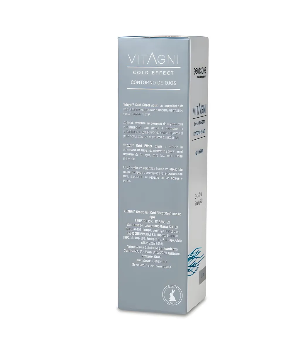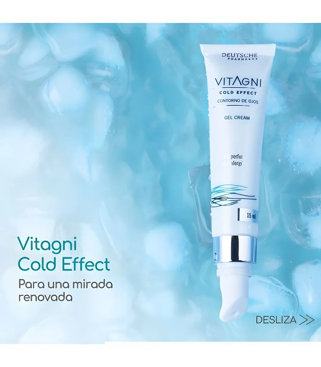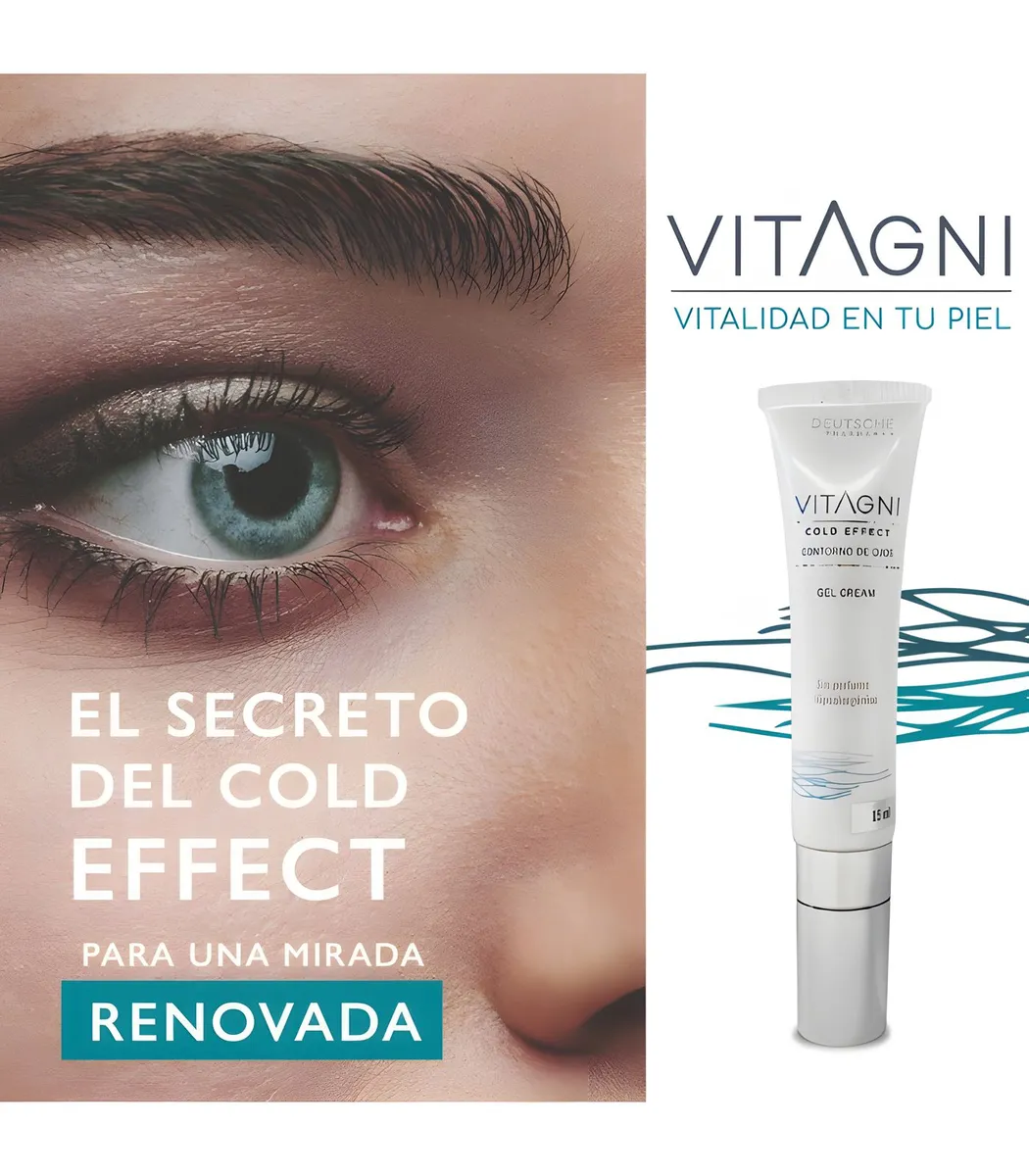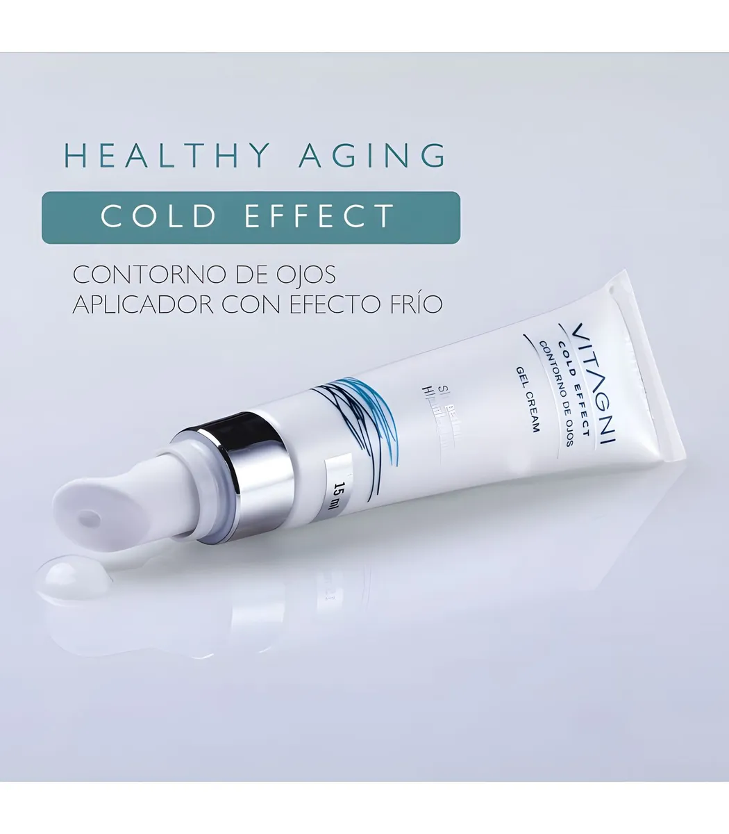 Vitagni Contorno de Ojos Cold Effect es una crema gel diseñada para el tratamiento intensivo del contorno de ojos. Su aplicador de cerámica otorga un efecto frío que ayuda a descongestionar la zona ocular, reducir bolsas y ojeras, y mejorar la absorción de sus activos. Su fórmula combina ingredientes marinos, ácido hialurónico, vitamina C, provitamina B5 y un complejo peptídico que hidrata, revitaliza y combate los signos visibles del envejecimiento con resultados visibles desde los 7 días de uso. Su diseño permite una aplicación higiénica y precisa sin contacto con las manos.
