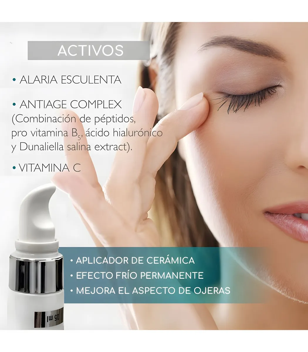 Crema gel con punta de cerámica de efecto frío para tratar bolsas, ojeras y líneas de expresión. Ideal para renovar y descongestionar la mirada.